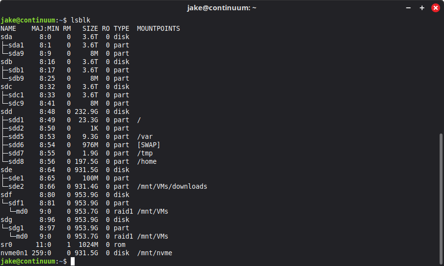 | lsblk | lists ssds, harddisks and other block devices. Stands for List Blocks or some such. It’s one of the most valuable tools for getting info about your storage devices.![]() |